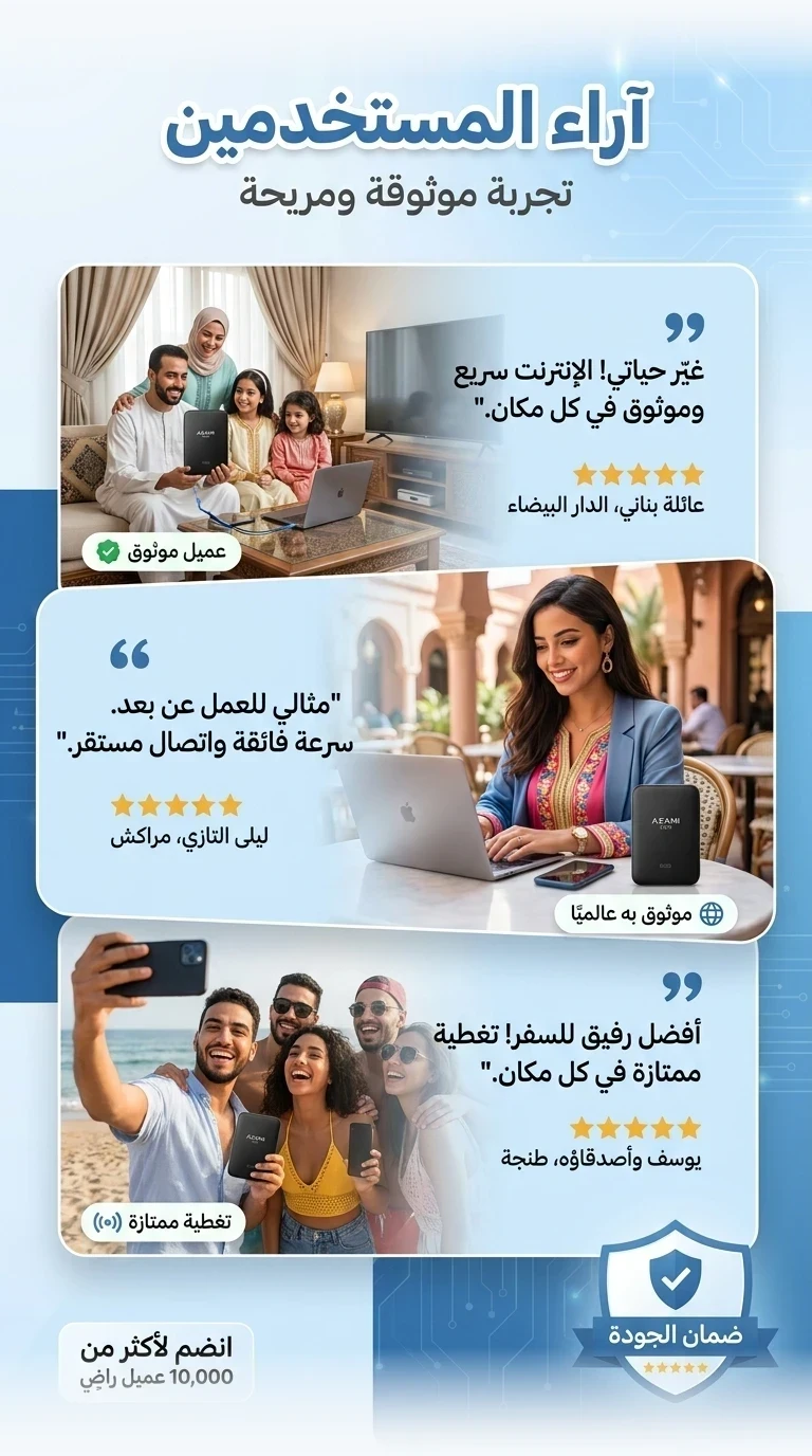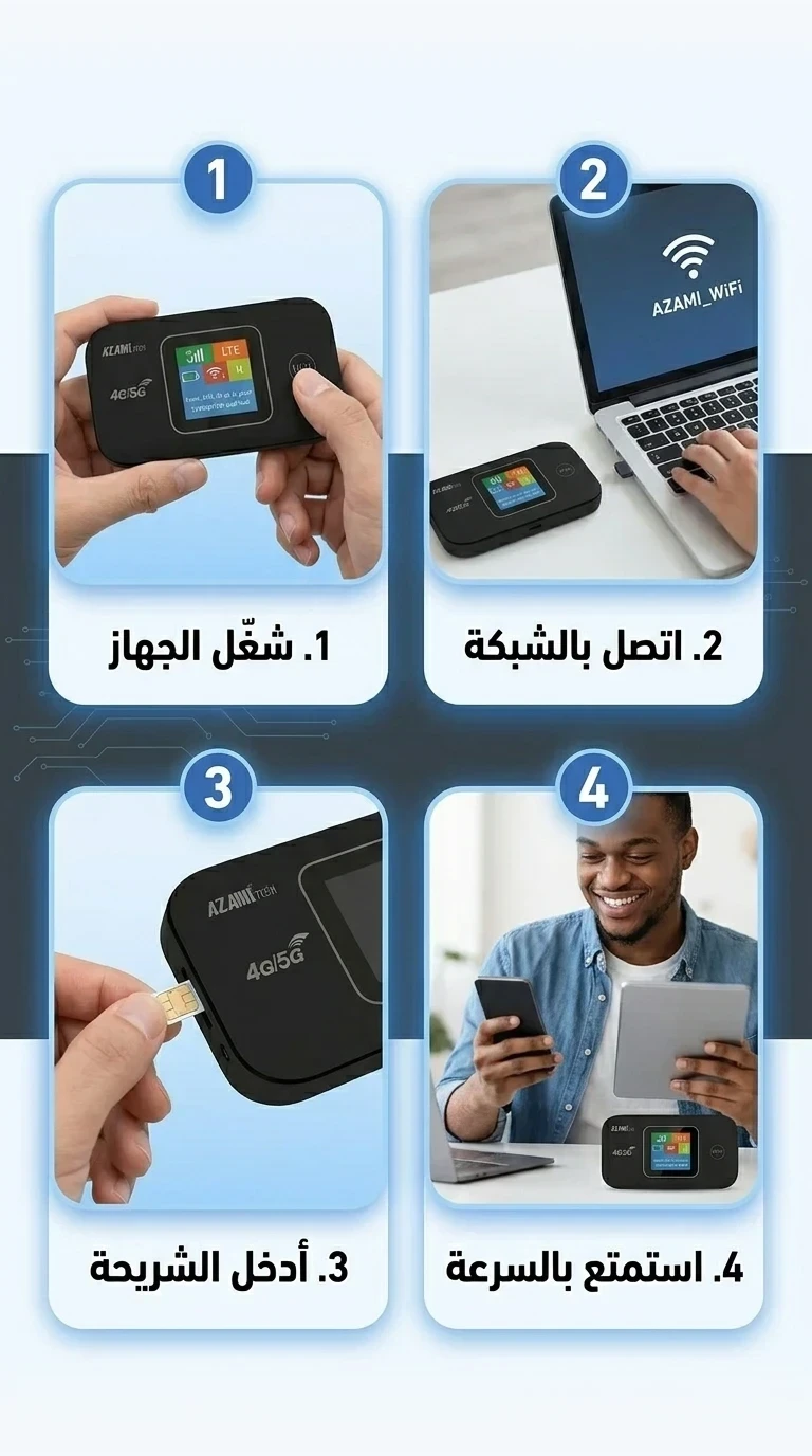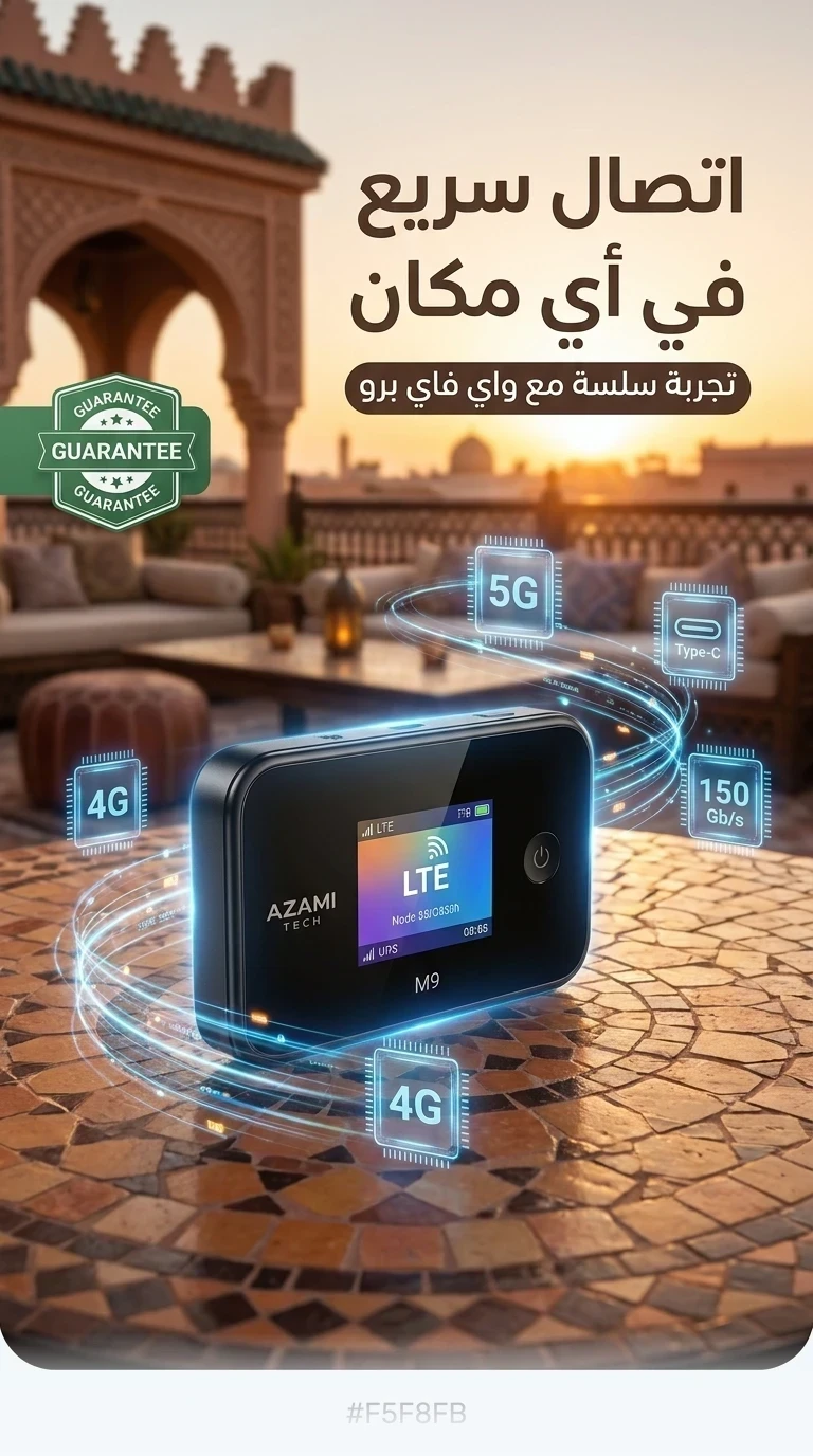 جهاز إم 9 يعطيك اتصال ثابت وسريع فالخدمة فالدار فالطريق وحتى فالسفر. يدعم الجيل الرابع والخامس ويشغل أكثر من جهاز بسهولة مع شحن تايب سي عملي يخليك ديما واجد بلا تقطاع.